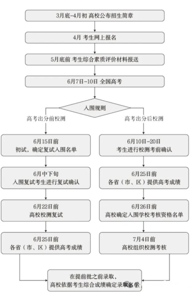 一般会定在高考之后,大部分高校的测试时间比较集中,具体考核时间查阅高校简章。6月下旬会公布确认入选名单。